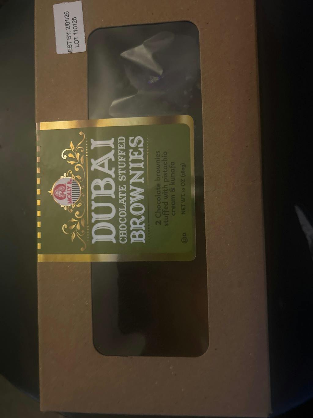 - 🍫 Decadent chocolate brownie with creamy Dubai pistachio filling